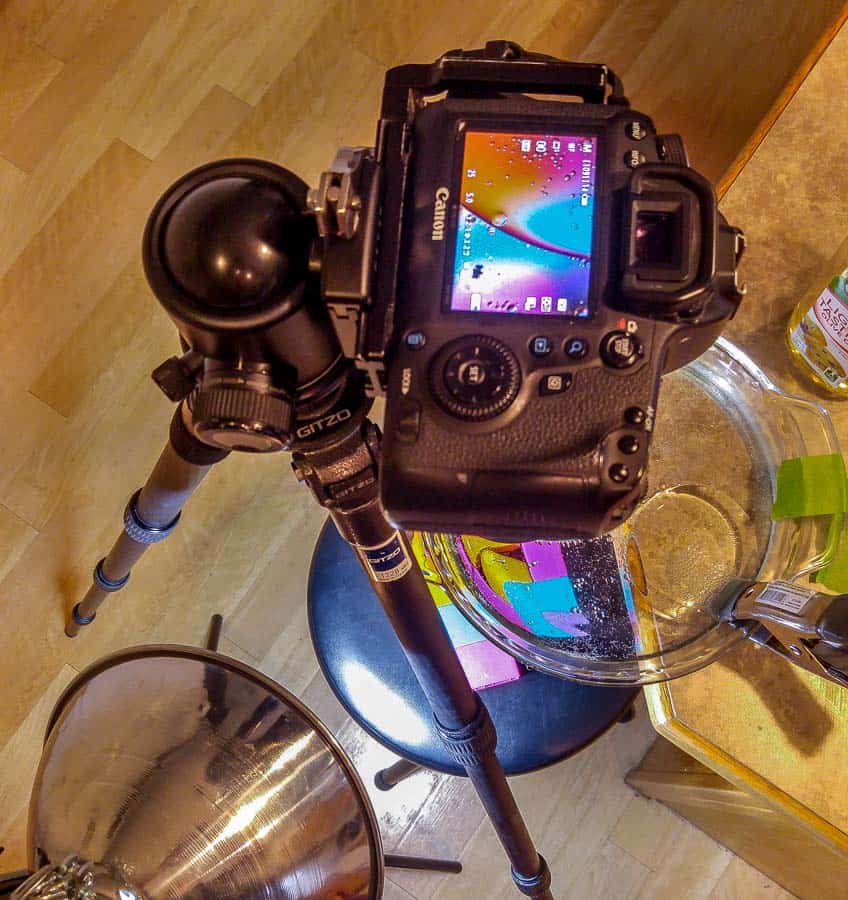 Como se ve desde arriba, la cámara mira hacia abajo a través de un plato de cristal extendido sobre el borde de un mostrador. El plato tiene alrededor de una pulgada de agua y una cucharada o más de aceite de oliva. Algunos bloques de colores se encuentran en un taburete a un pie debajo del mostrador y se encienden con una lámpara de pinza (abajo a la izquierda). La profundidad de campo limitada hace que los bloques sean simplemente borrosos. Canon 6D con macro Tamron de 90 mm y tubo de extensión Canon EF 25 II.