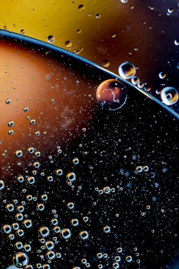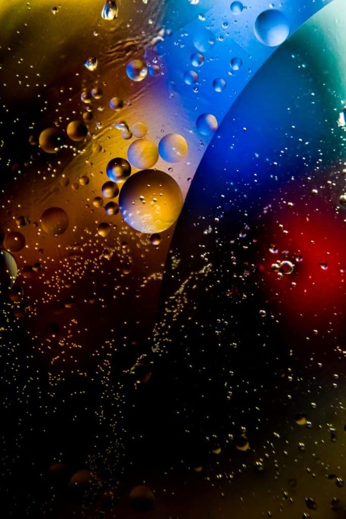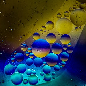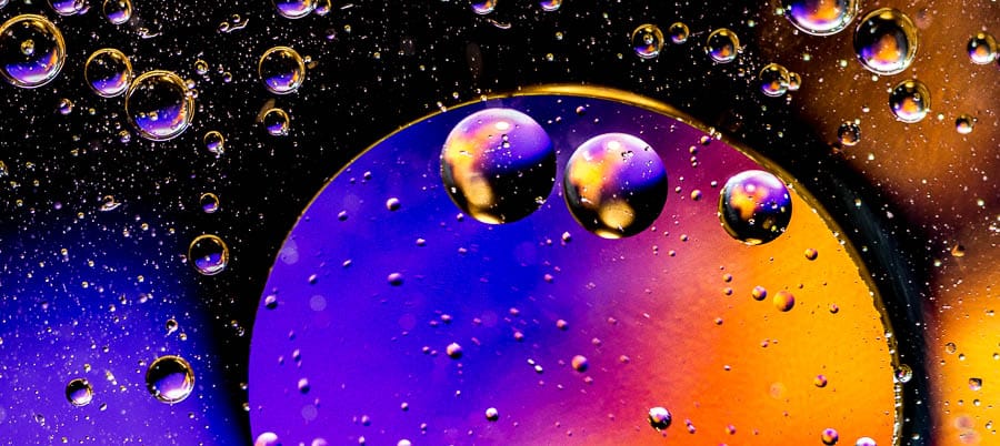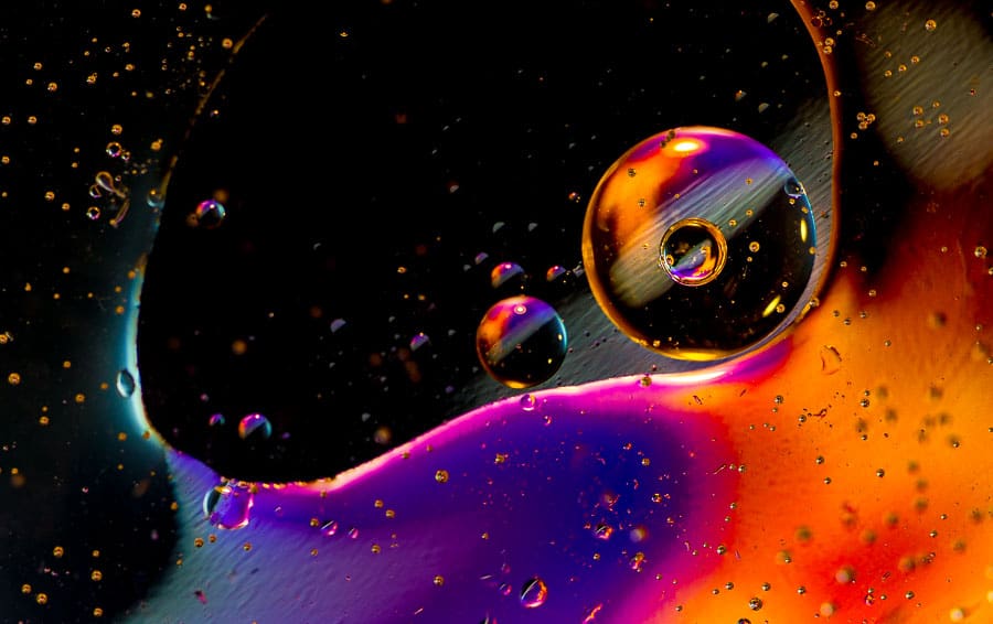 - La elección de la apertura será su ajuste más importante aquí, ya que desea una profundidad de campo mínima, suficiente para mantener la capa superior de agua/aceite nítida, pero el fondo tan borroso como sea posible. Mira los ejemplos aquí para ver algunas ideas, pero dependiendo de tu lente, la distancia a la superficie del agua y la distancia al fondo, necesitarás ajustar el f/stop de acuerdo a esto.