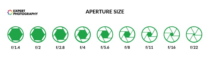 En fotografía, el tamaño de la apertura se mide en f-stops. El tamaño de apertura más estrecho es f/32 o f/22, y el más ancho suele estar entre f/1,8 y f/1,2.