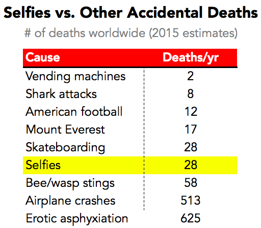 La búsqueda de más "me gusta" y seguidores, junto con la posibilidad de volverse viral, está empujando a los obsesionados consigo mismos a participar en todo tipo de comportamientos idiotas, imprudentes y, a veces, incluso potencialmente mortales. Probablemente hayas oído hablar de muertes por selfies que superan las muertes causadas por ataques de tiburones y otras estadísticas relacionadas, que muestran cuán estúpidas pueden volverse las personas cuando practican la obsesión por sí mismas. Solo eche un vistazo al siguiente cuadro compilado por la gente de Priceonomics.com , que muestra dónde se encuentran las muertes relacionadas con selfies en comparación con otras: